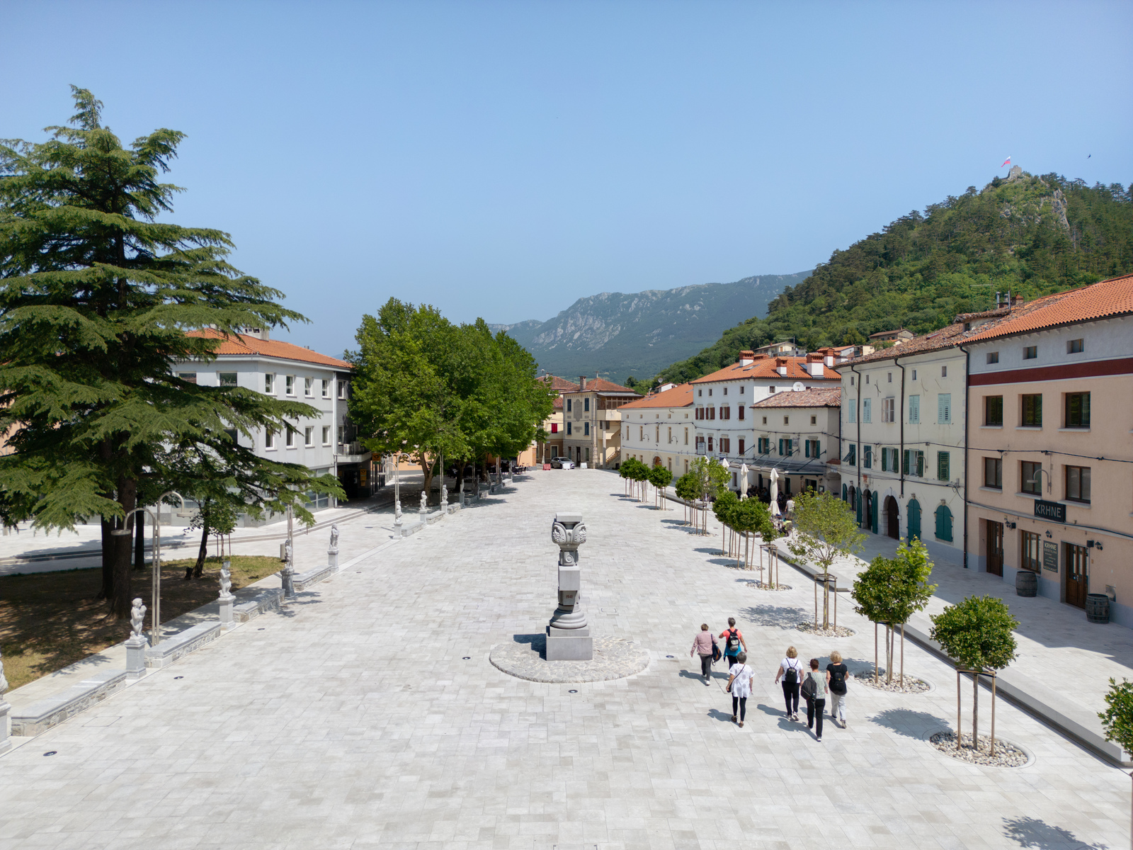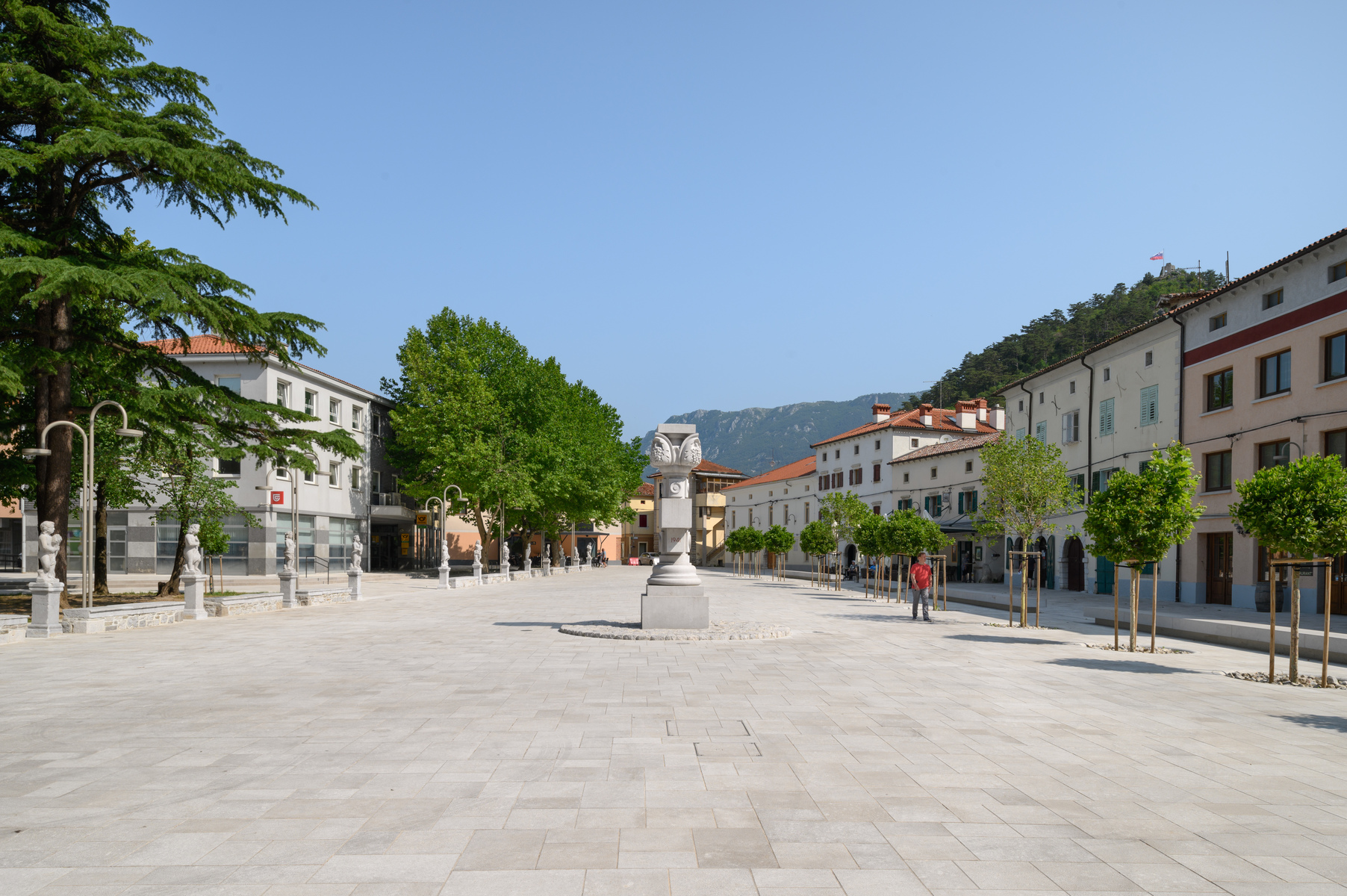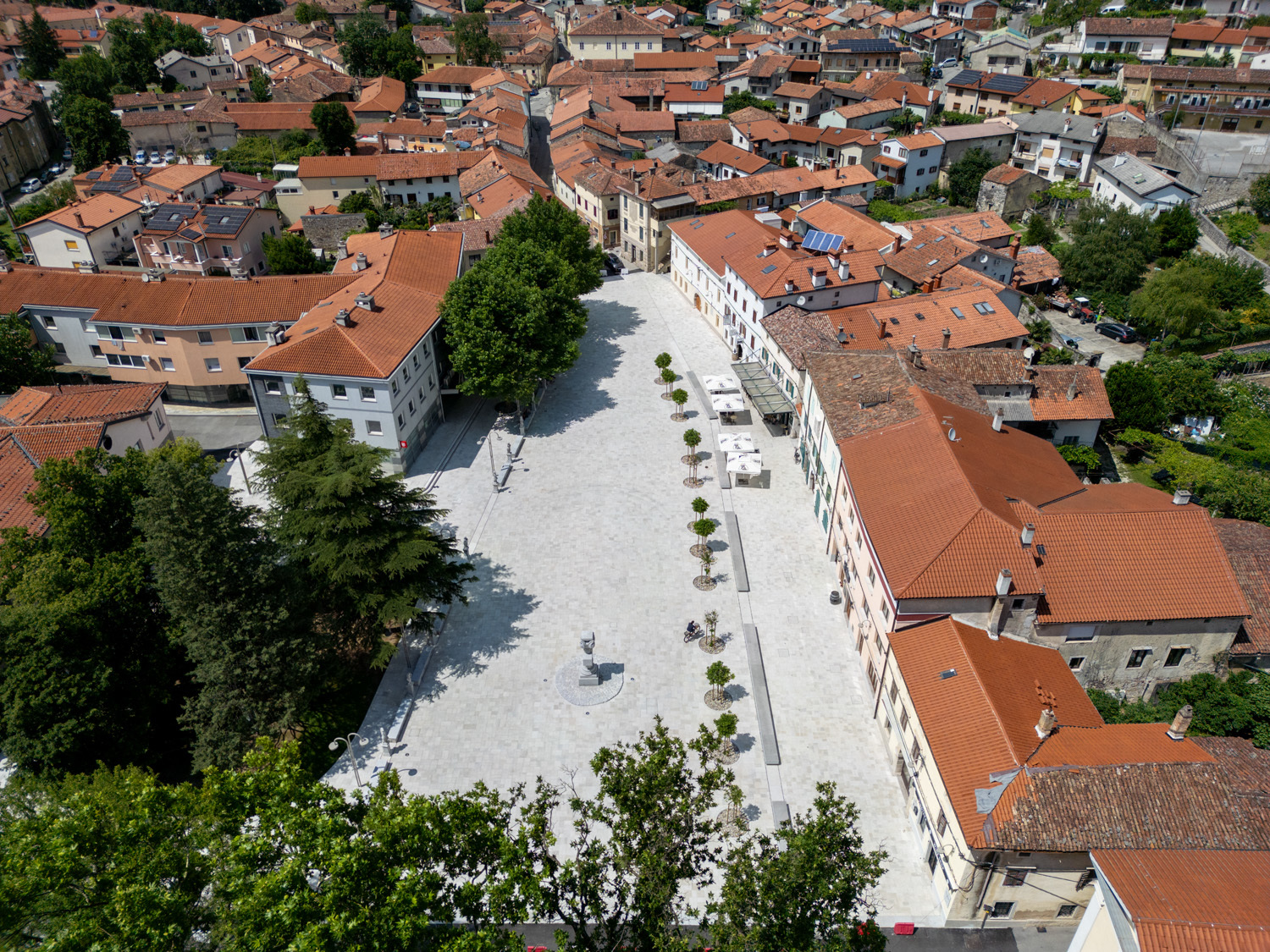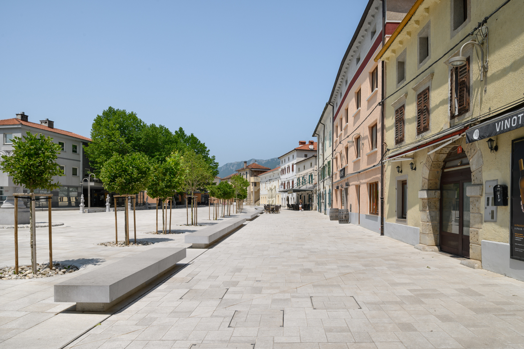Uporaba avtohtonega kraškega kamna daje trgu materialno in simbolno težo. Gre za kamen, ki je stoletja sooblikoval arhitekturo širšega prostora in je navajen burje, sonca in časa. Detajli tlakovanja – v stikih, robovih in prehodih – razkrivajo premišljeno razumevanje prostora in potrjujejo arhitekturno načelo, da se smisel celote razkrije prav skozi natančno oblikovanje detajlov.