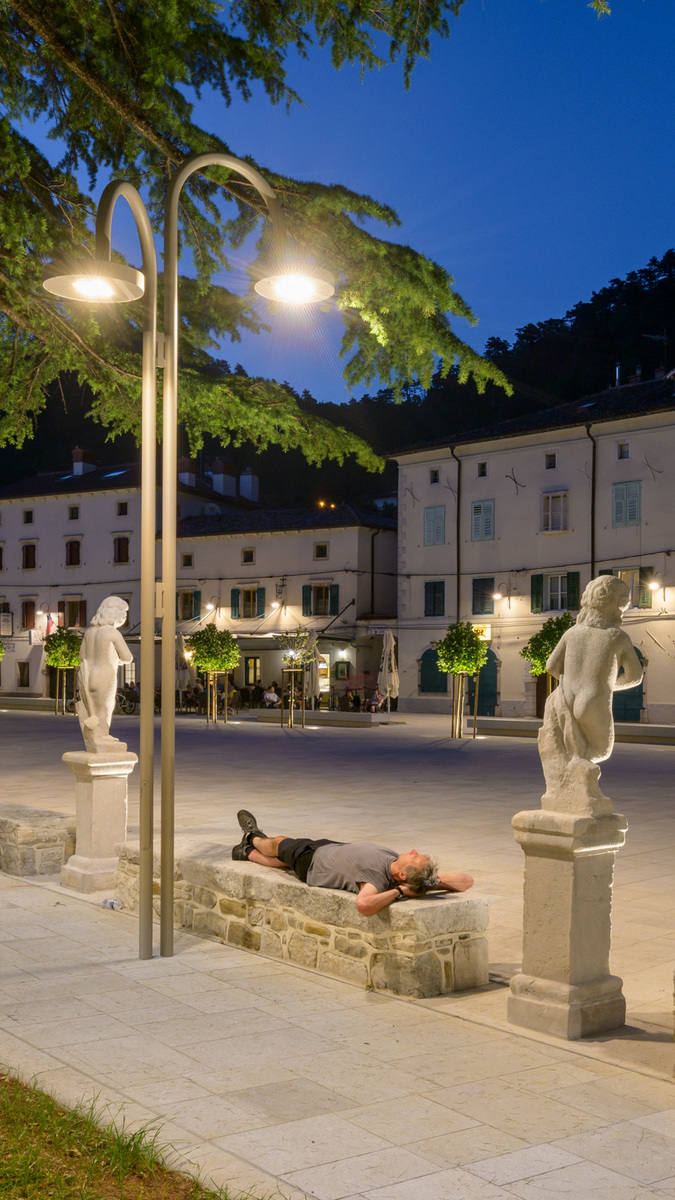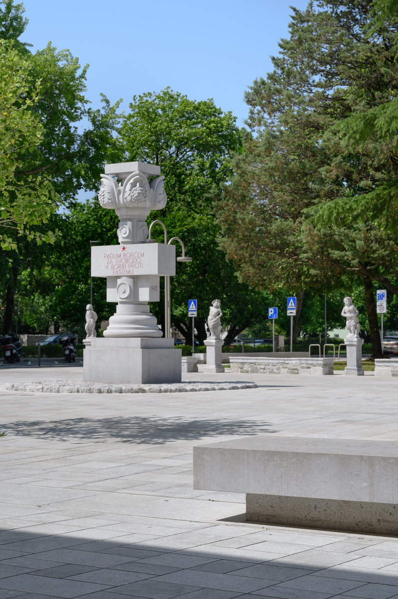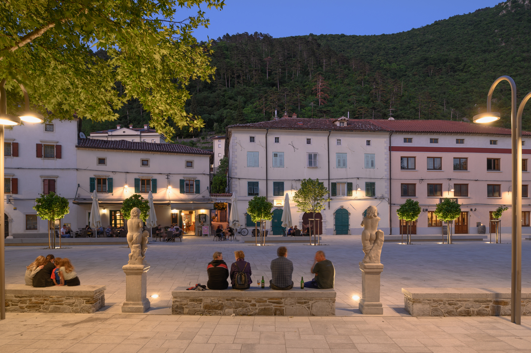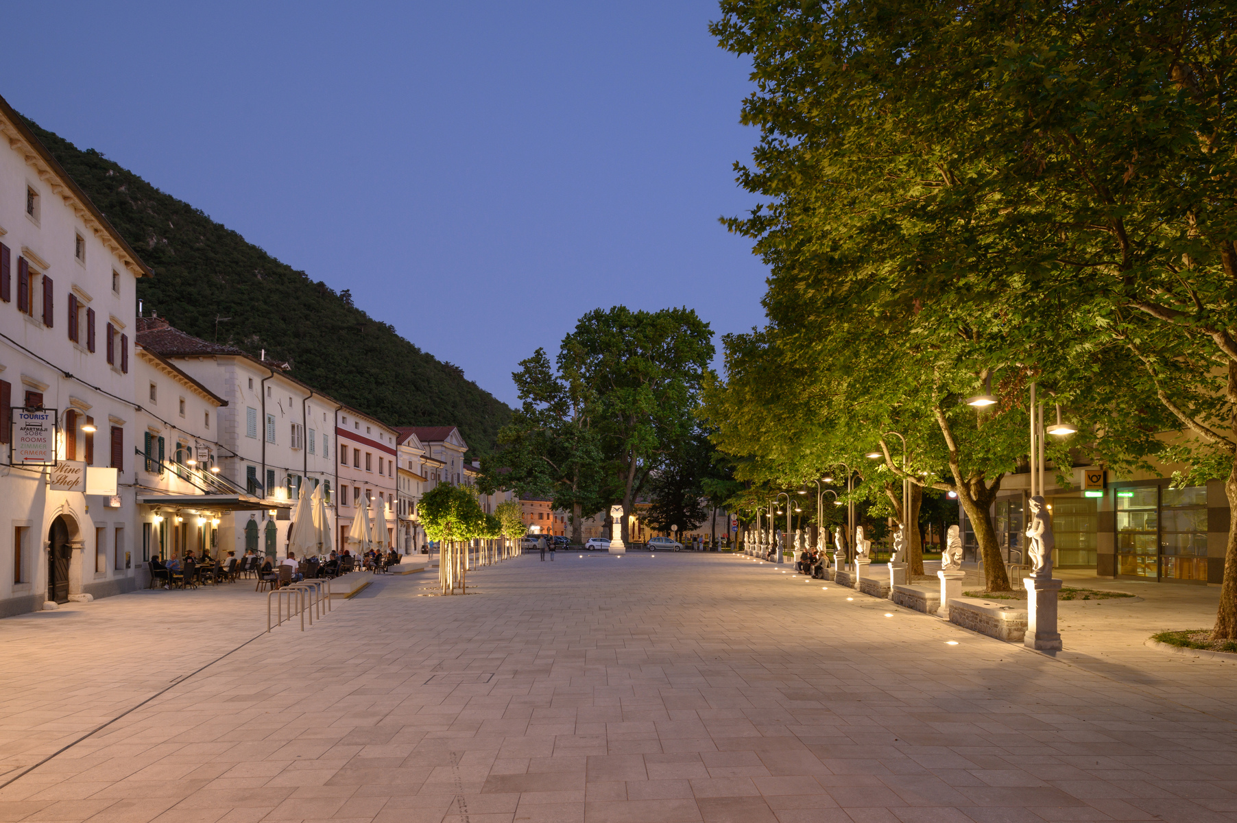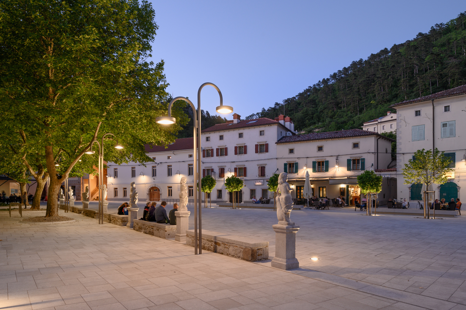 Uporaba avtohtonega kraškega kamna daje trgu materialno in simbolno težo. Gre za kamen, ki je stoletja sooblikoval arhitekturo širšega prostora in je navajen burje, sonca in časa. Detajli tlakovanja – v stikih, robovih in prehodih – razkrivajo premišljeno razumevanje prostora in potrjujejo arhitekturno načelo, da se smisel celote razkrije prav skozi natančno oblikovanje detajlov.