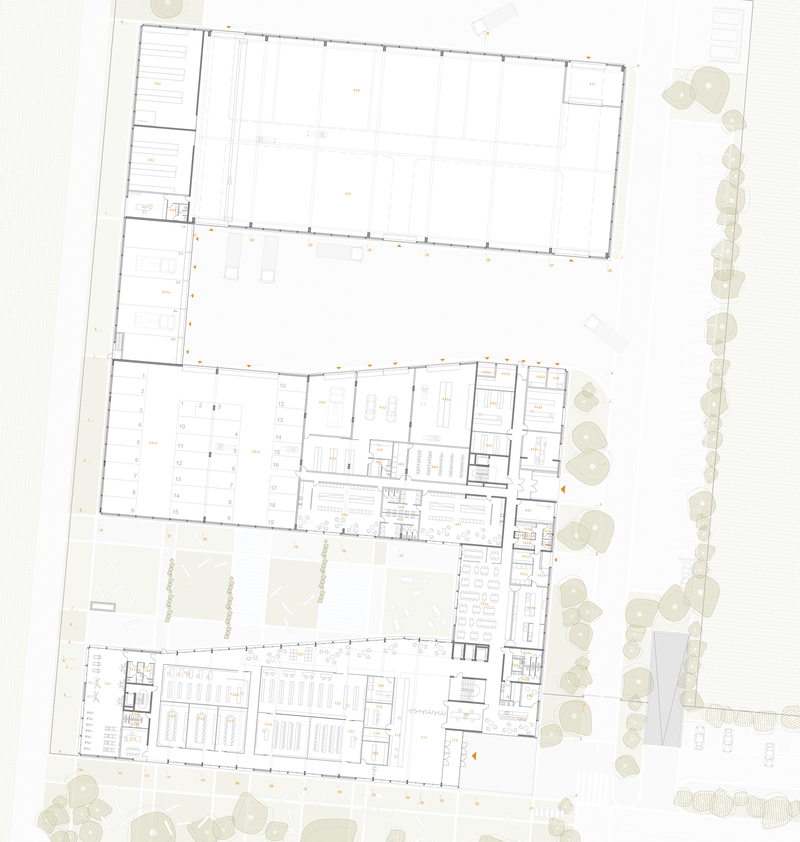 Objekt Novega poslovnega kompleksa za izvajanje operativnih dejavnosti v Beričevem je v prostor postavljen tako, da spoštuje karakteristike ravne topografije terena. Objekt je zato zasnovan kot dolg in nizek volumen, ki se meandrasto zavije okoli dveh programsko ločenih atrijev. Prvi atrij služi kot ambientalna ozelenjena zunanja površina (»viseči vrtovi«), v katero so orientirani pisarniški prostori. V atrij so orientirani tudi vsi javni prostori avle, okrepčevalnice, jedilnice in drugi. Atrij je krajinsko urejen z vodno površino in visečim zelenjem, ki v atriju zagotavlja dodatno senčenje. Tako imenovani viseči vrtovi predstavljajo tudi osrednjo ambientalno atrakcijo stavbe. Drugi atrij se nahaja med prostori skladišč, delavnic in garaž za terenska vozila ter delovnimi stroji.Drugi atrij predstavlja glavno manipulacijsko ploščad, ki se širi proti globini atrija in je tako na najširšem delu širok 26 metrov, kar omogoča nemoteno delovanje vseh delovnih procesov in dostave.