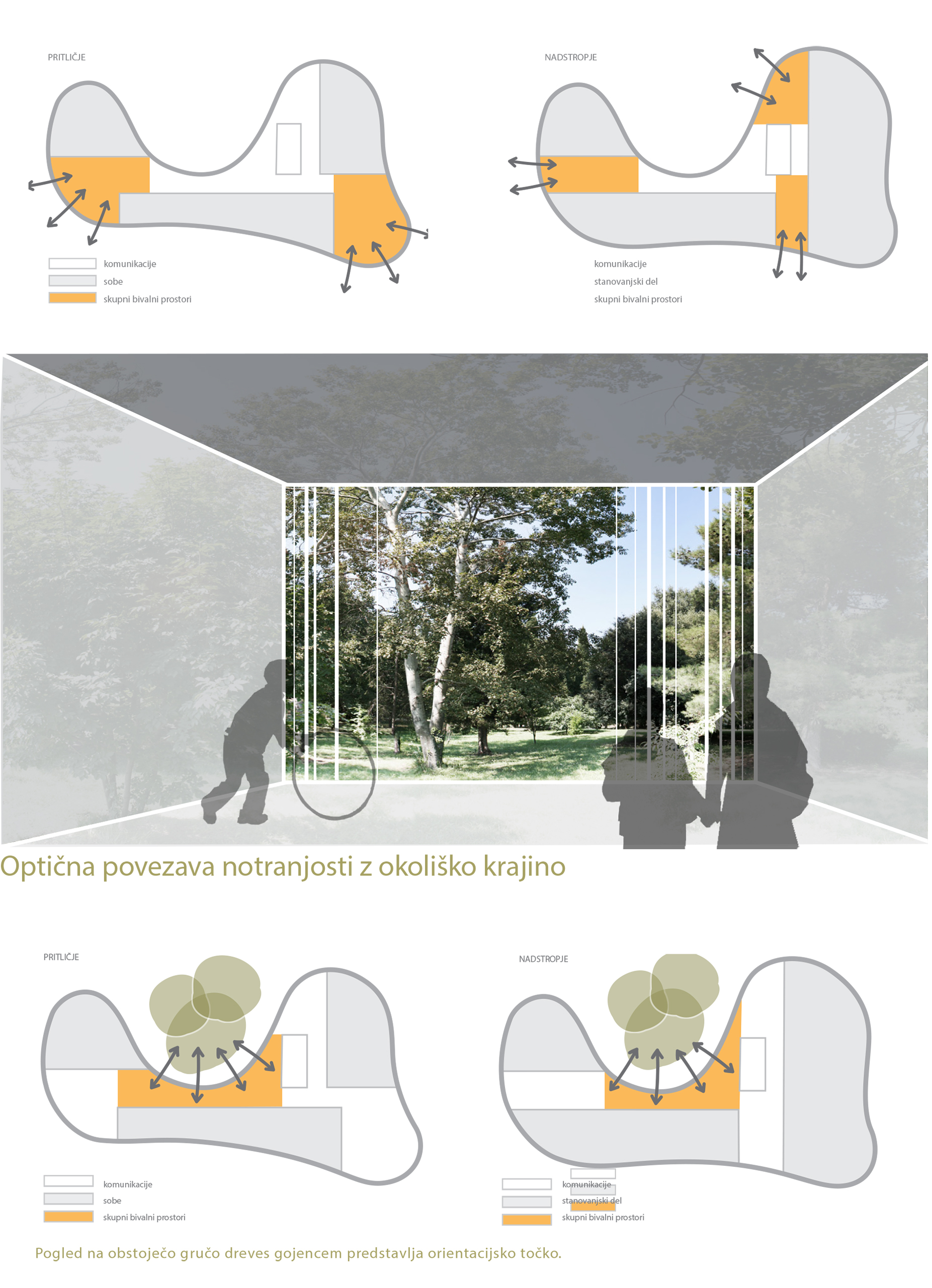 Zaradi velike steklene stene je na tem mestu kontakt notranjosti z okolico najbolj neposreden. Osrednji javni prostor s pogledom na navedeno skupno dreves predstavlja orientacijsko točko pri gibanju po objektu, kar gojencem dodatno olajša gibanje po objektu.