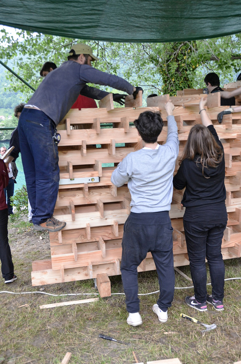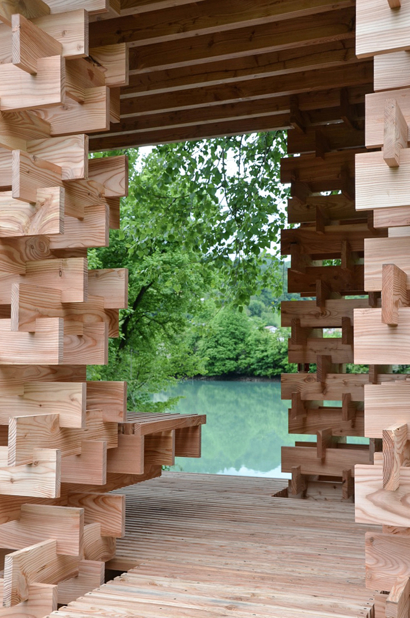 Prof. Tomaž Krušec, gostujoči mentor Rok Kuhar, z asistenti Matevžem Zalarjem, Jernejem Girandonom, Mihatom Mundo, Nežo Novak in 15 študenti so v Mostu na Soči postavili lesen paviljon. Več na internetni strani www.seminarkrusec.com