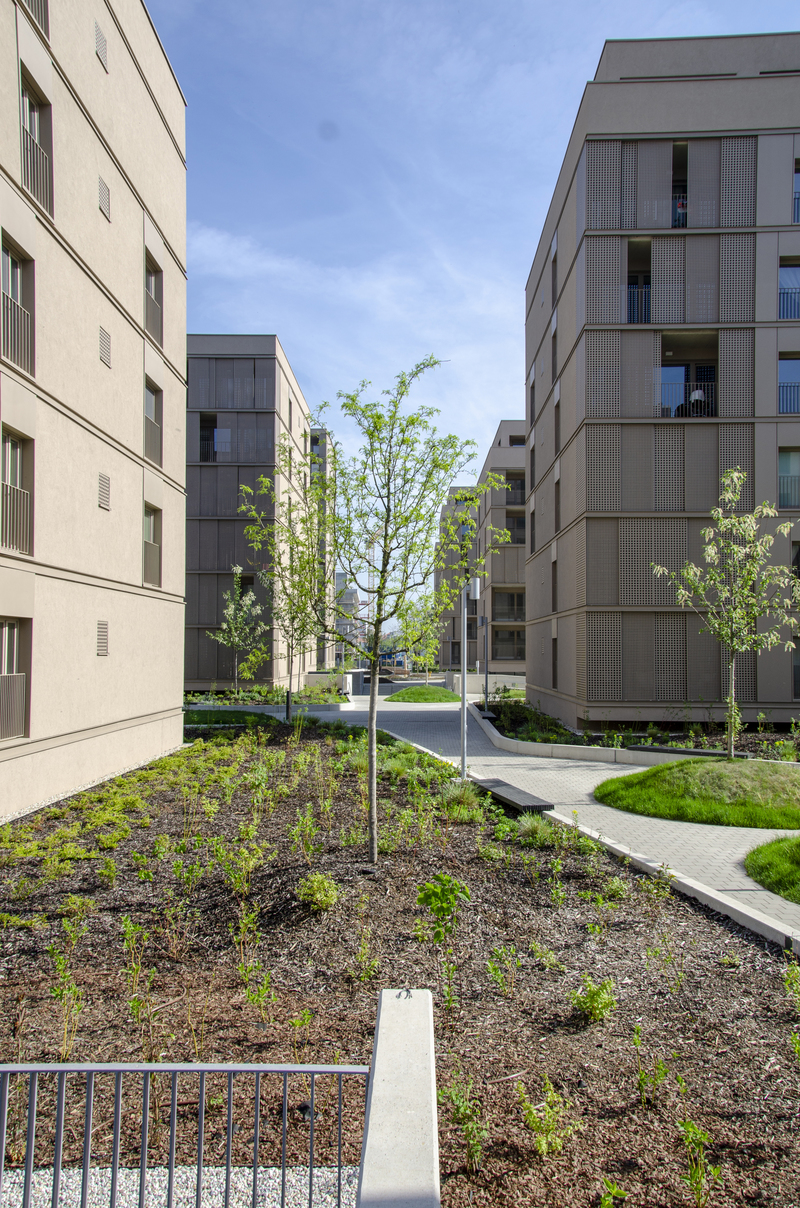 Parter stanovanjskega naselja je zasnovan kot kontinuirana, krajinsko urejena ploščad, ki je dvignjena nad nivo mesta. S tem postane park, ki obkroža stanovanjske bloke, razgibana ozelenjena platforma, ki omogoča in spodbuja socialno interakcijo med stanovalci. Odprti prostori med stavbami prehajajo drug v drugega, stavbe pa so postavljene v grmovne otoke, obrobljene z nizkimi zidovi, ki postavljajo jasno ločnico med zasebnim in javnim.